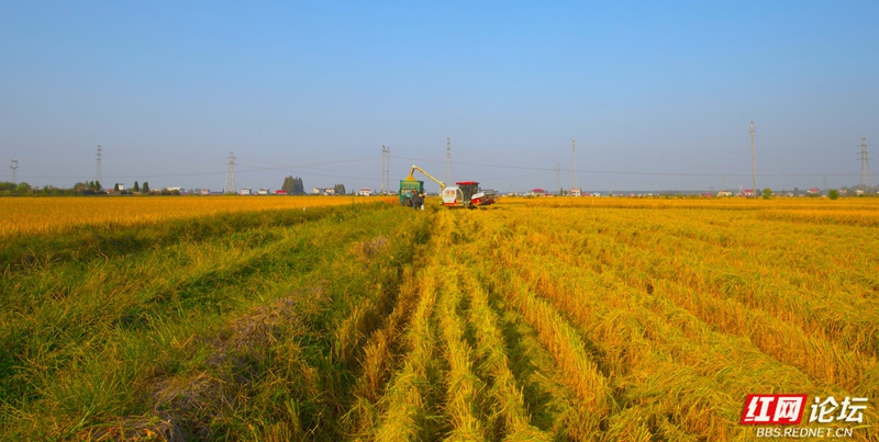 田野间,金浪翻涌的稻穗在微风中起伏,与斑驳翠绿的田块交织成大地的调色盘,色彩斑斓,层次分明。农机在田间穿梭忙碌,奏响一曲动人而欢快的丰收交响曲。村庄静卧其间,青瓦白墙在秋阳下显得格外安详,炊烟袅袅,鸡犬相闻。整个乡村弥漫着金秋的丰盈与喜悦,每一帧都写满了大地的馈赠与生活的美好。(图文/刘华斌)