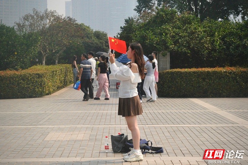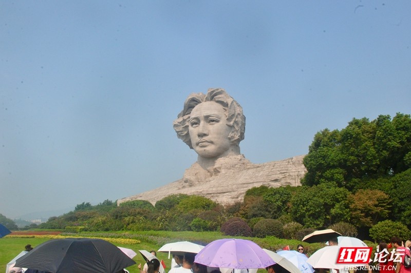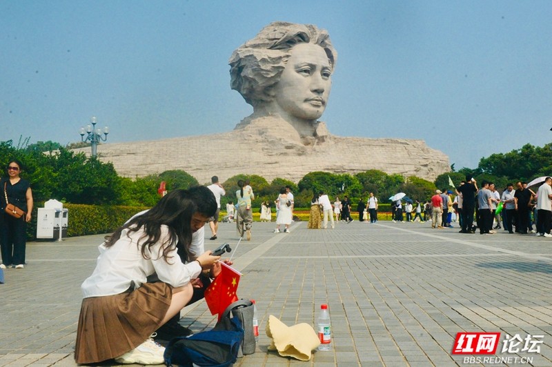 越往北,人声渐起。当青年毛泽东雕塑赫然入目时,小火车正好停在最佳观景点。雕塑眉宇之间,尽是风华正茂的意气,仿佛仍怀胸中丘壑,目光如炬。基座前,一对青年情侣正蹲着看手机里的照片,国旗轻展于他们手中,如一朵无声绽放的红花。更多游客聚集而来,穿白衣的少女举着相机,精神抖擞,镜头里满是秋日的憧憬。