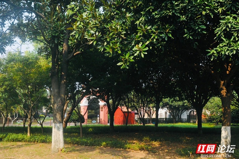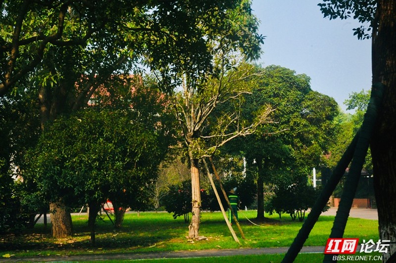 南端的林木沐浴在清晨的阳光里。路旁香樟树的树干下部被整齐刷上白灰,如同系着洁白的围裙,在晨光中静默伫立。阳光穿过叶隙,斑驳地洒在草地上,光点如星子般轻舞。有一棵树,被支架小心扶着,一侧枝叶稀疏,另一侧却如绿云般蓬勃舒展——这生命的倔强姿态,仿佛在无声诉说:洲上的万物,都在以各自的方式,倔强地生长。