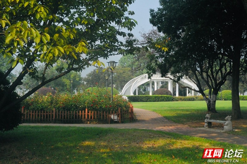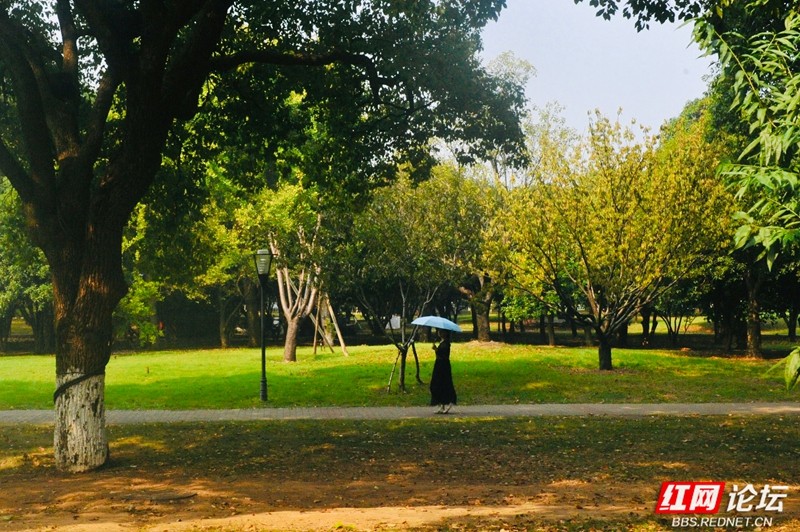 右边蜿蜒的小径牵引着我的目光向前延伸。石雕松鼠长椅静守路口,白色拱桥在远处划出一道优雅的弧线。更令人驻足的是一位撑着浅蓝伞的黑裙女子,独自行走在林荫道上。伞影摇曳,裙裾微动,寻常小路被她走出了一种诗意的韵律,仿佛戴望舒笔下的丁香姑娘,轻轻掠过秋日的晨风。