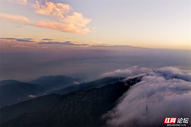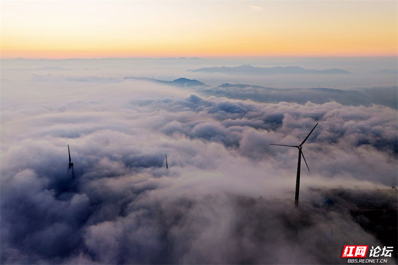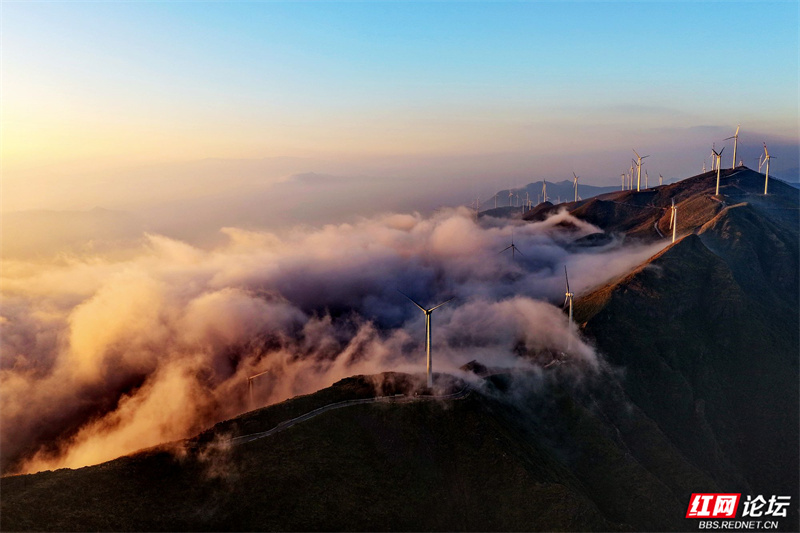 当第一缕晨曦刺破天际,桂林市兴安县的摩天岭化作云海秘境。翻涌的云絮如棉浪铺满山谷,巨型风力发电机似银翼巨人,在橙黄与粉紫交织的天幕下,于云涛间若隐若现。