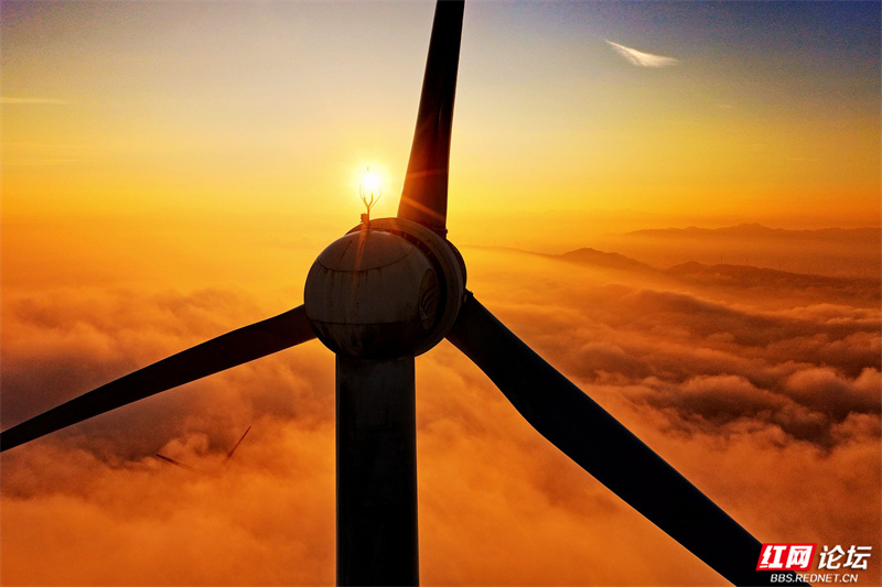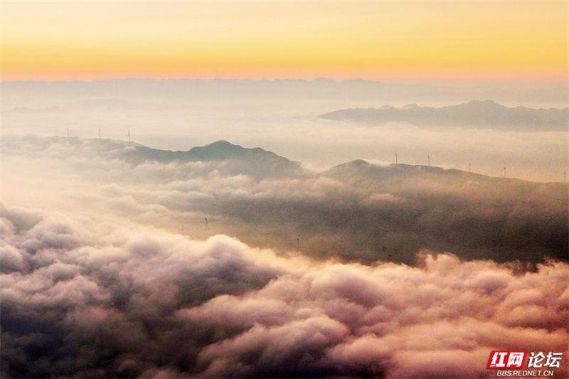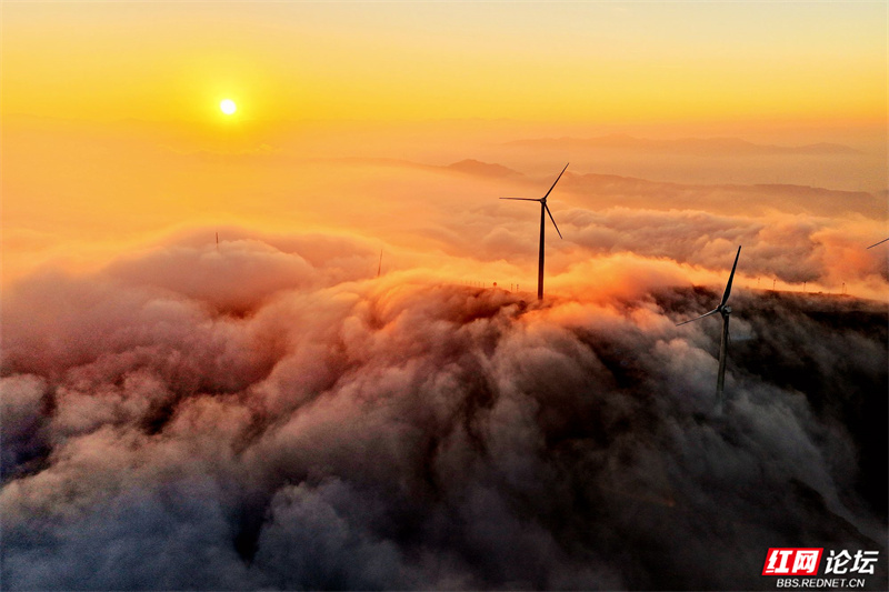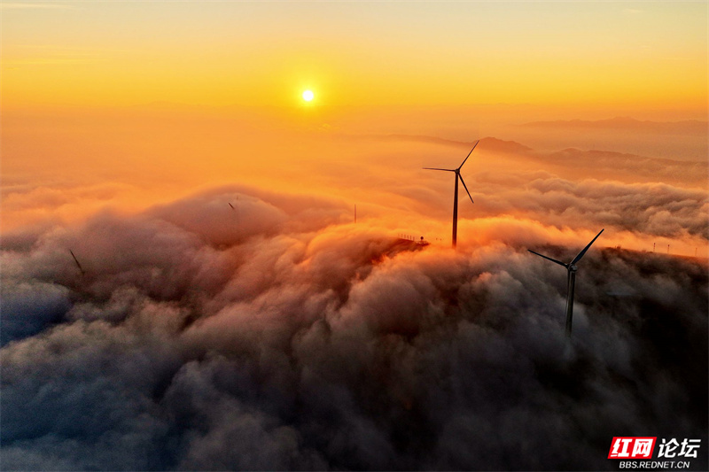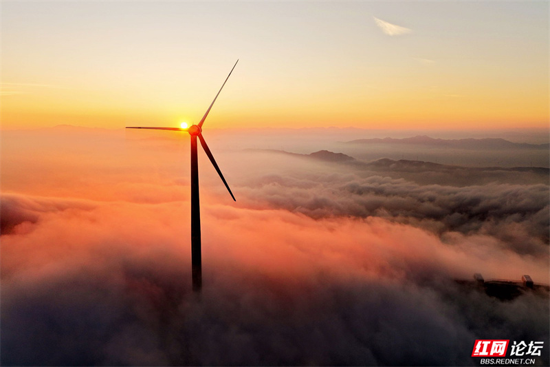 晨光为云海镀上金边,山与云缠绵,风与光和鸣,大自然的鬼斧神工与人类向绿而行的诗意在此交融 —— 摩天岭的清晨,是天地与科技合奏的绝美序曲。(图文/杨勇)
