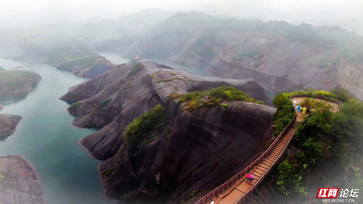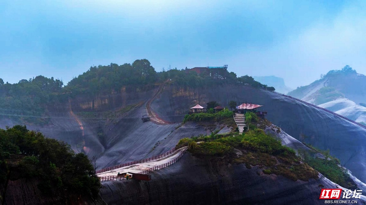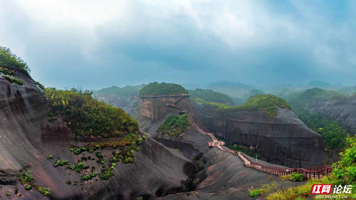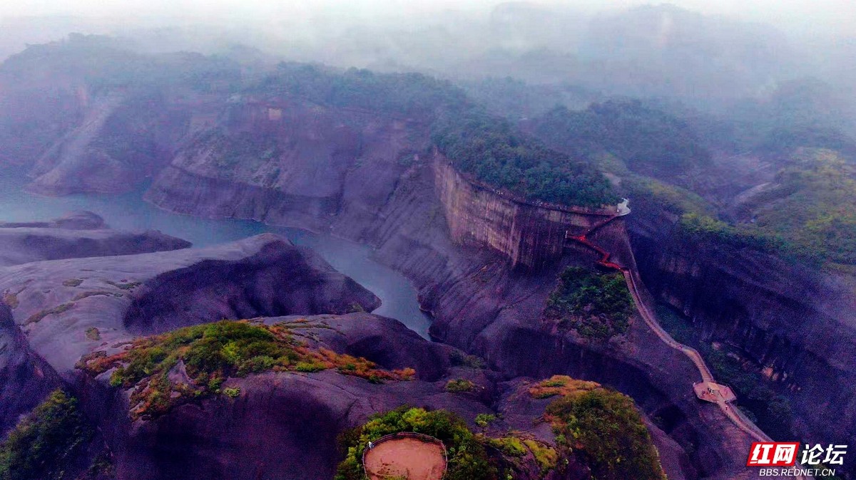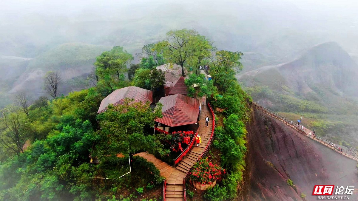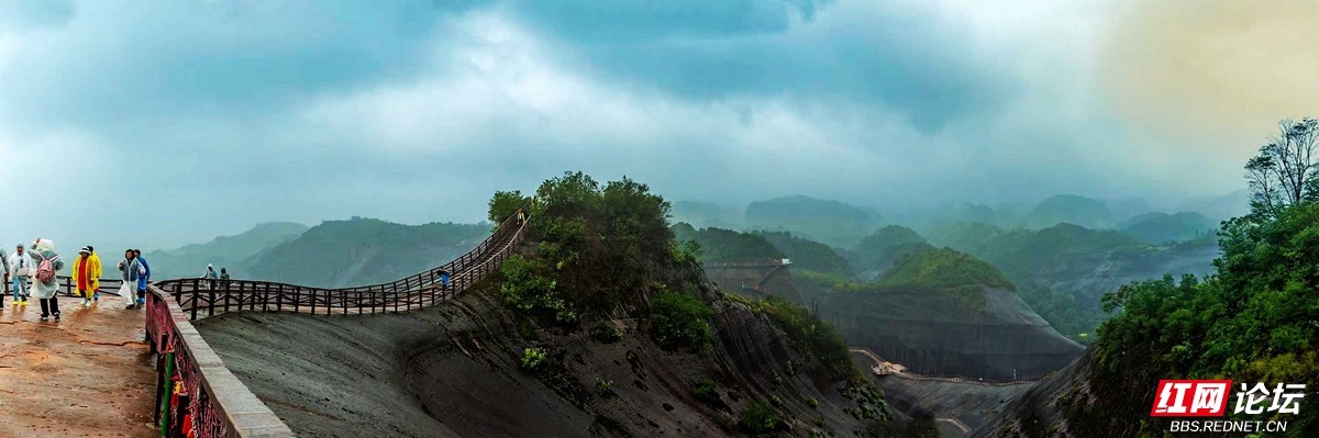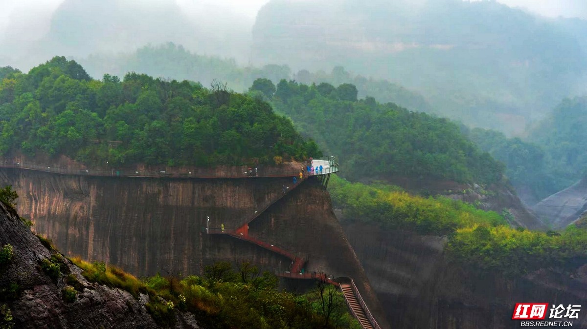 又到重阳登高时,高椅岭的雨雾成了一份天赐的意外惊喜。撑一把伞漫步于山间栈道,看乳白色的雾气在丹霞沟壑间悠悠流转,如轻纱般为陡峭的红岩披上朦胧的面纱。深吸一口裹挟着草木芬芳的沁凉空气,往日的忙碌与喧嚣瞬间被洗涤一空,只余此刻——在雨雾氤氲的天地间,与这鬼斧神工的自然奇景温柔相拥,满心满肺都是松弛的惬意。