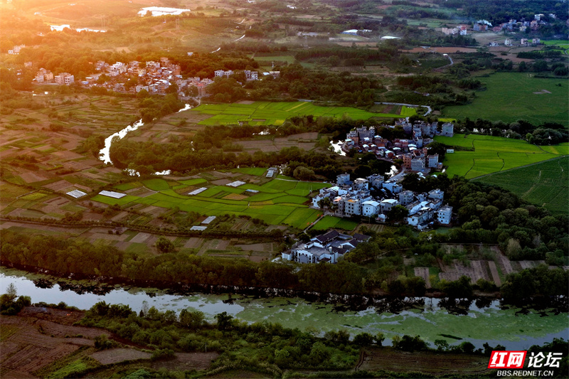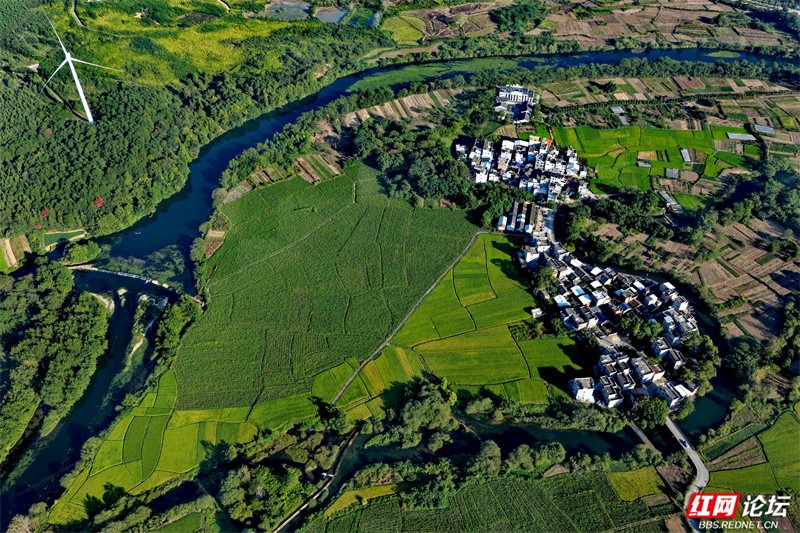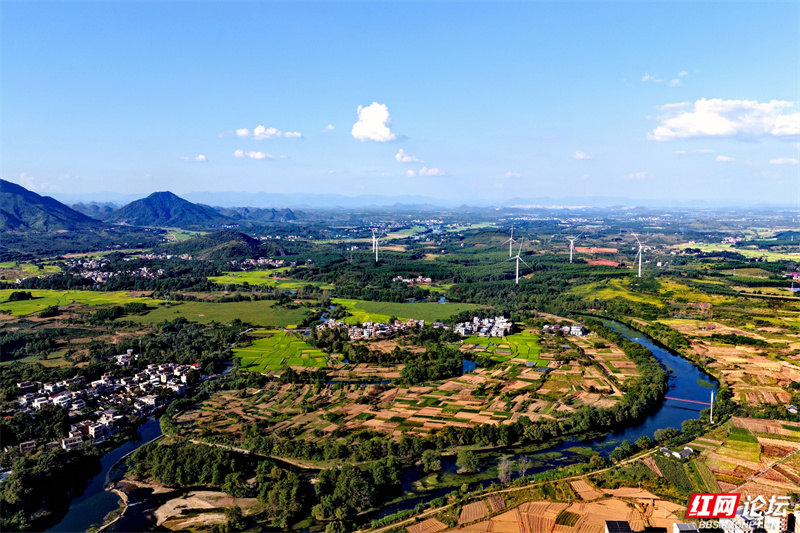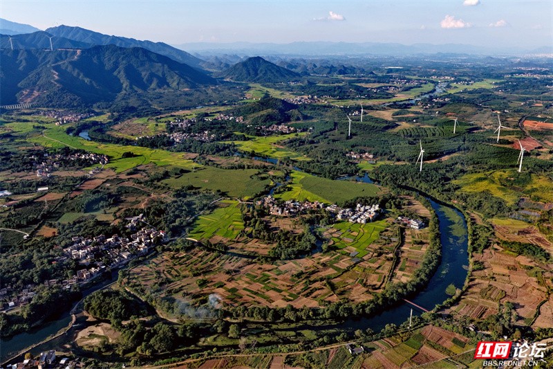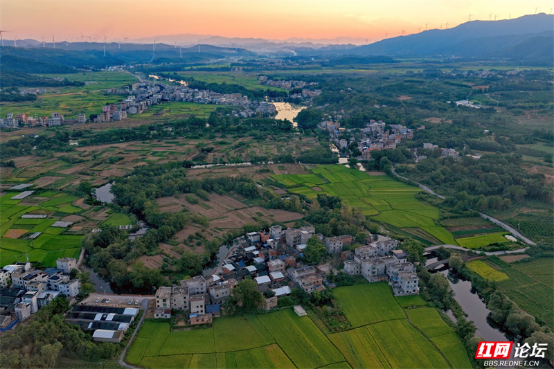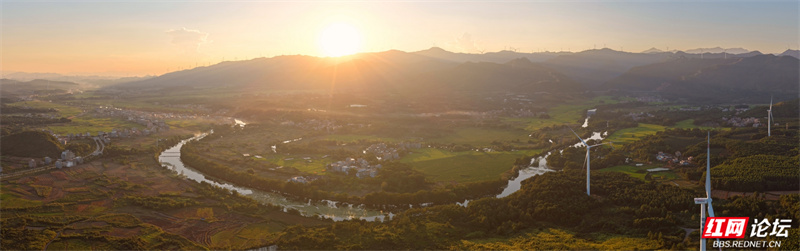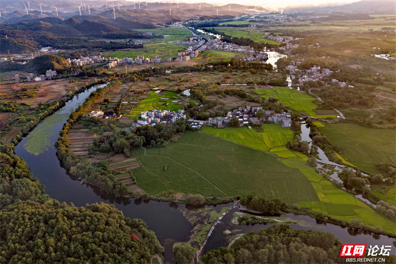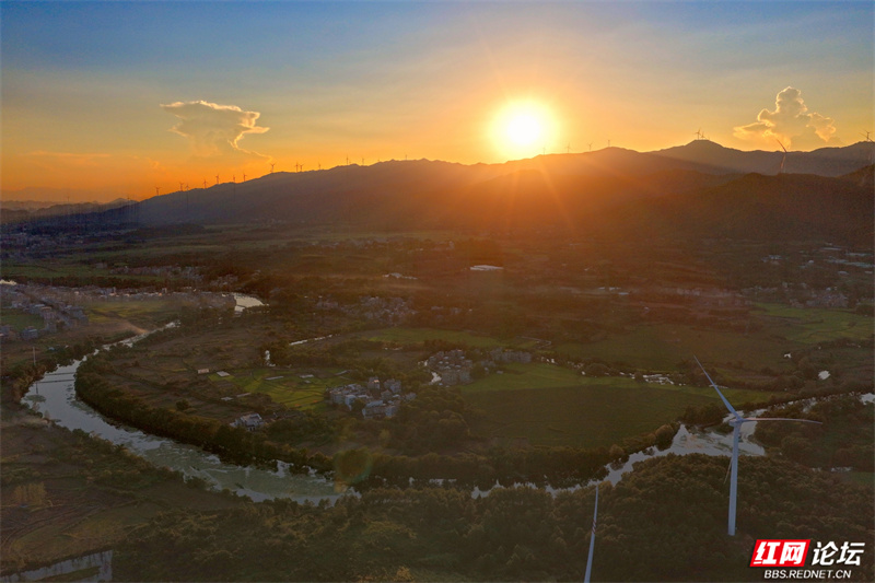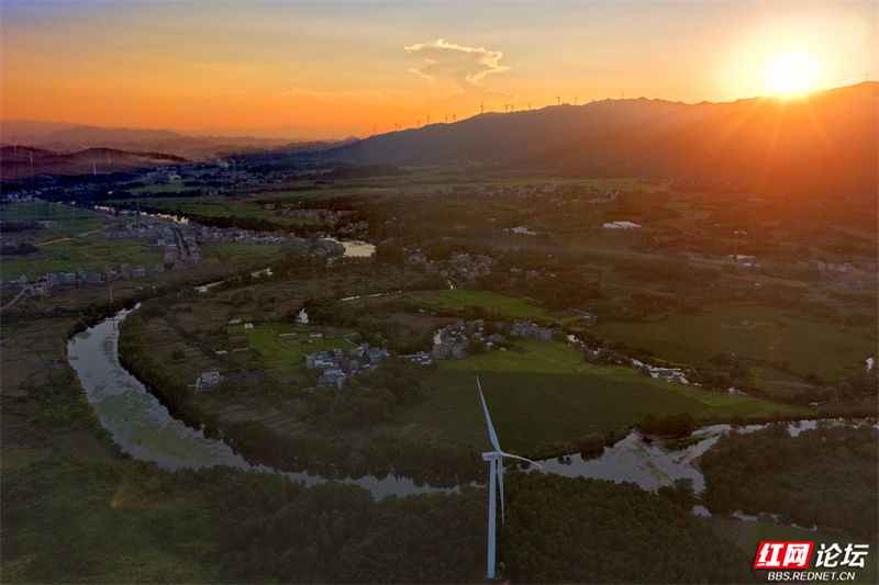 江永的大地间,蜿蜒的河流似灵动丝带穿梭,田园色块错落如天然调色盘,风车在山岗悠悠转动,村落静静依偎于山水怀抱。当夕阳金辉倾洒,仿佛能瞥见女书文字里流淌的温婉气韵,在这片灵秀天地中,自然之美与女书文化的独特韵味悄然交融,诉说着江永独一份的诗意与故事。(摄影:杨勇)