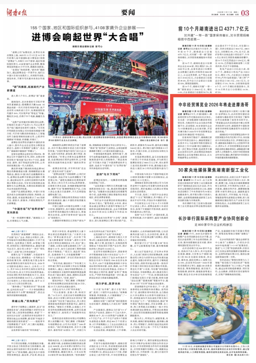 湖南依托中非经贸博览会和中非经贸深度合作先行区两大平台,务实推动与非洲各国全方位、多领域交流合作。湖南省商务服务中心主任张军平表示,明年6月,中非经贸博览会走进非洲活动将在摩洛哥举办,诚挚邀请中摩各界人士积极参与,支持中非经贸深度合作先行区建设,携手谱写中非经贸合作高质量发展的崭新篇章。