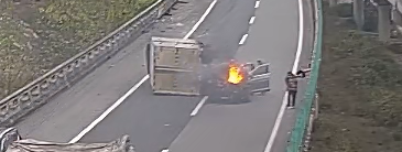 事故发生后,小车驾驶人蒙某因受到惊吓一直坐在车上未撤离,不久小车冒出火光,小货车驾驶人郑某在观察情况不对后立即上前将蒙某抱出车辆。此时路过的大货车驾驶人从车上拿出灭火器,帮助车辆灭火,索性事故未造成更严重的后果。