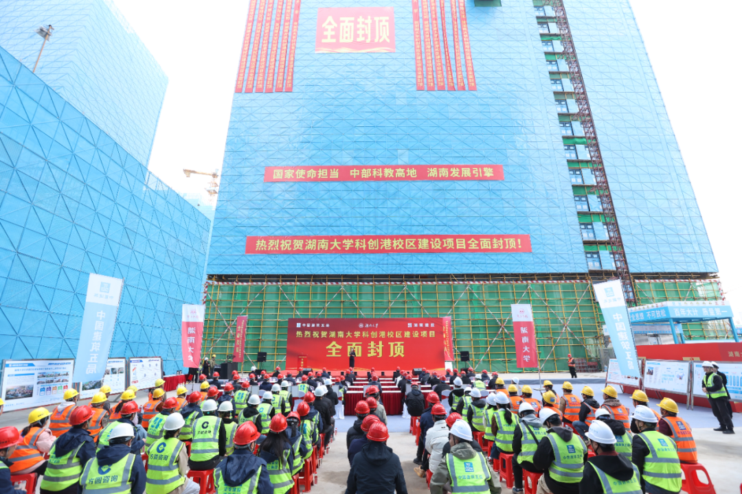 12月16日,湖南大学科创港校区建设项目三标段顺利完成主体封顶。这一关键节点的达成,标志着科创港校区一期工程33栋单体建筑全部完成主体结构施工,项目建设正式全面转入装饰装修、机电安装及校园功能完善的攻坚阶段。
