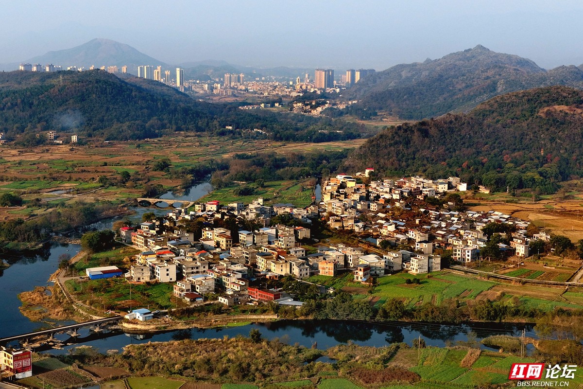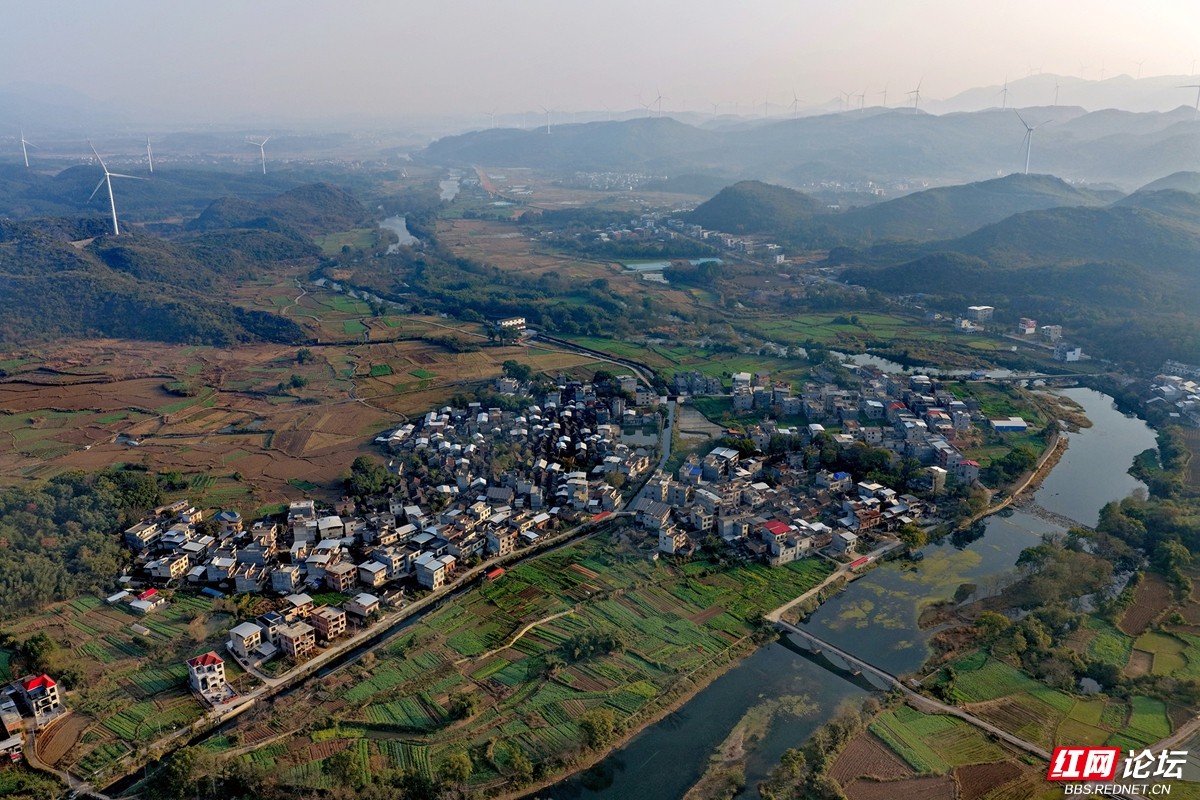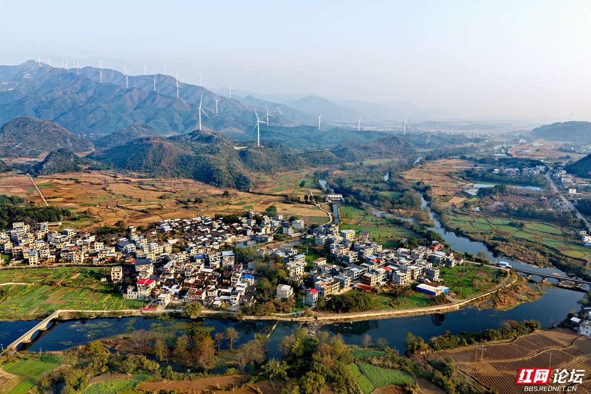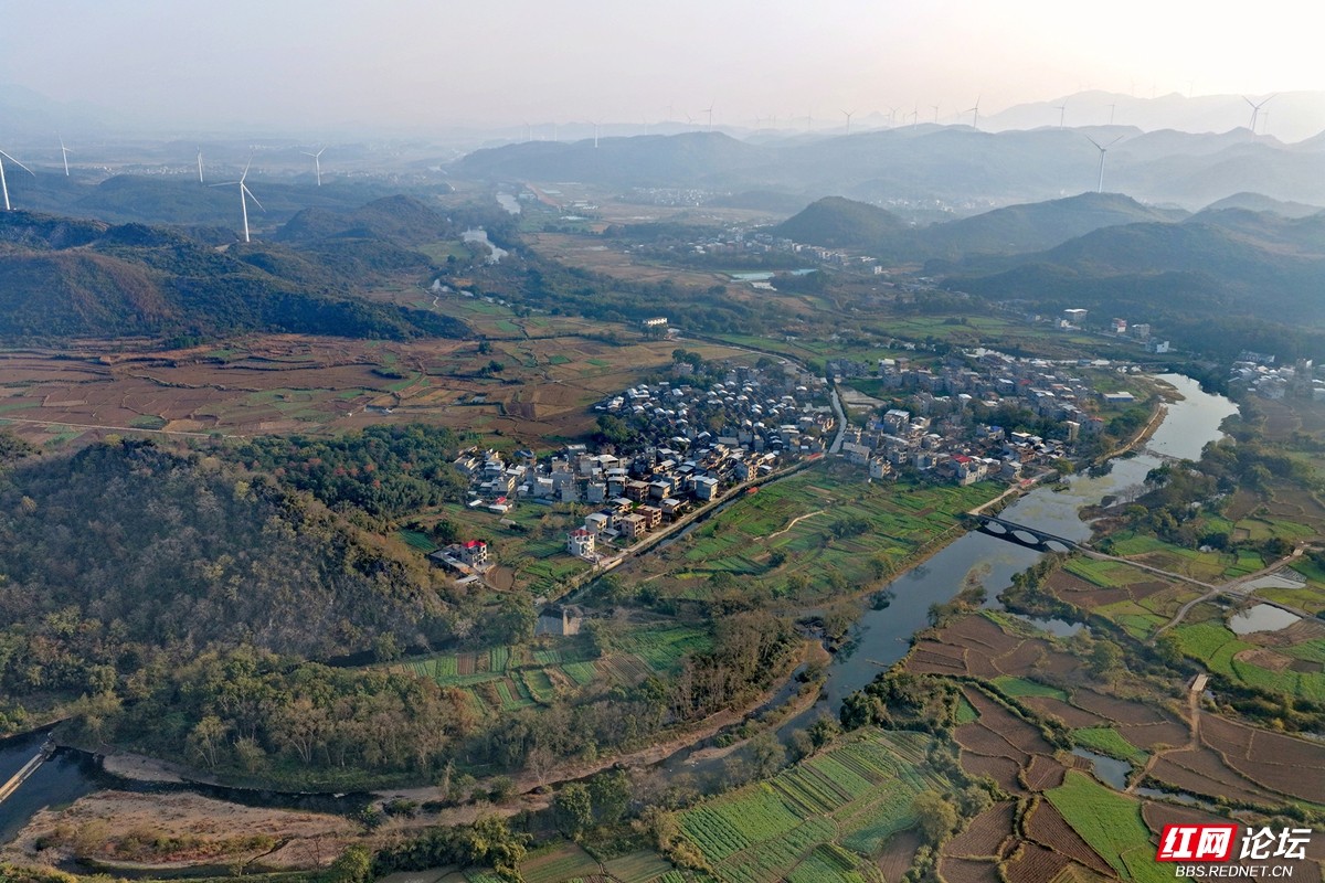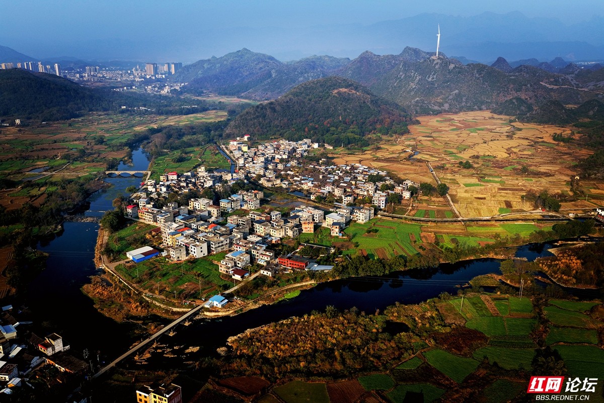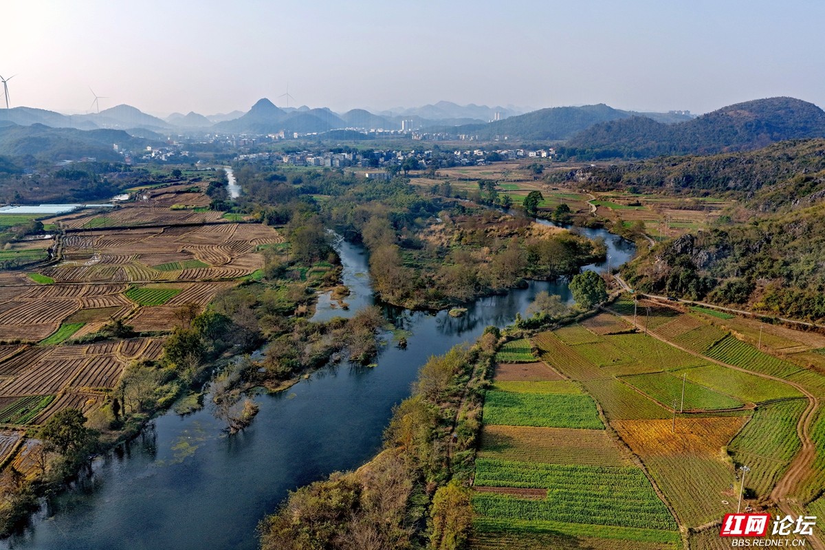 澄澈的河水蜿蜒流淌,环抱着错落有致的村舍,两岸田畴黄绿相间,宛如大自然信手铺展的锦绣画卷。远处,喀斯特峰林层叠起伏,深绿与浅褐交融,山巅的风车缓缓转动,仿佛拨动着山野的静谧节拍。近处,农家炊烟袅袅,与远处城市楼宇朦胧的轮廓遥相呼应,天地间交织着乡野的清润与人间的烟火。风轻轻拂过,带着冬日特有的安宁与恬淡,将这一切凝成一幅静谧而生动的田园诗篇。