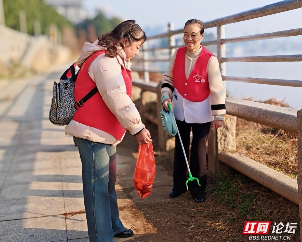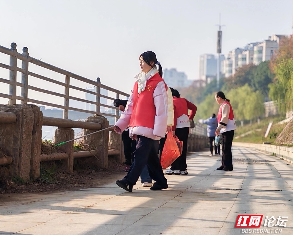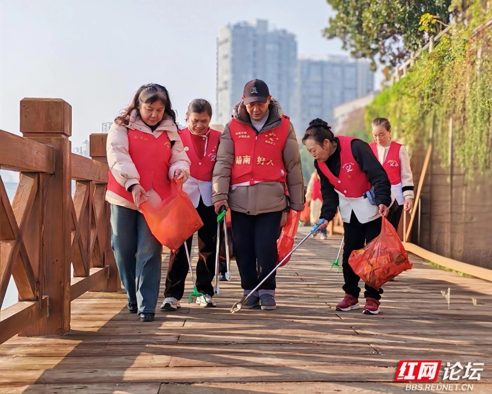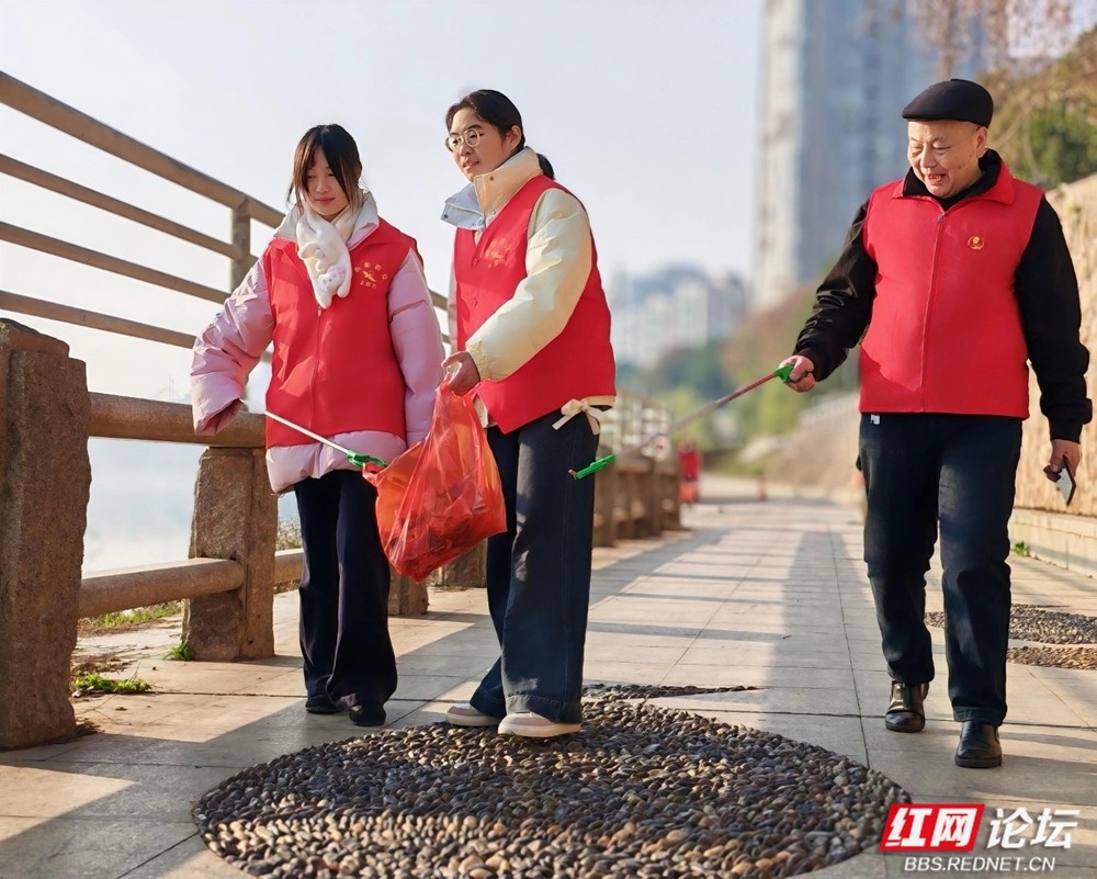 冬阳拂湘江,志愿红点亮一江碧水。(图源:wangxin781214)