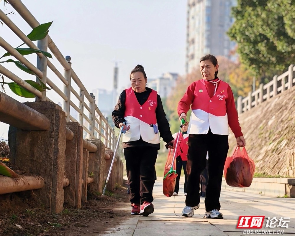 湘江两岸风光带草木葱茏,经过提质改造的岸线本是市民休憩赏景的好去处,却仍有零星垃圾藏匿于草丛石缝之间。志愿者们迅速分工,或沿堤岸缓步巡查,或俯身于滩涂清理,形成一道流动的风景线。年轻人身手矫健,踮脚伸手便能夹起树枝间的塑料袋;年长的义工经验丰富,用小铲子细细铲除粘附在地面的纸屑;亲子组合格外温馨,家长手把手教孩子分类投放垃圾,稚嫩的小手认真捡拾着每一个烟头。“小心脚下湿滑!”“这里有个塑料瓶漂在水面!”互助的叮嘱声、工具的碰撞声与江水的潺潺声交织,暖意驱散了冬日的寒凉。