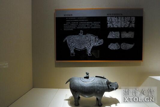 1981年,湘潭县九华乡船形山出土的商式青铜器盛酒器——猪尊,造型别致、形似野公猪。猪背设带盖椭圆形口,为酒的出入口。盖捉手塑造凤鸟,肘部饰夔龙纹。前后肘部有横穿的管孔,可以穿系绳索,供人抬举。