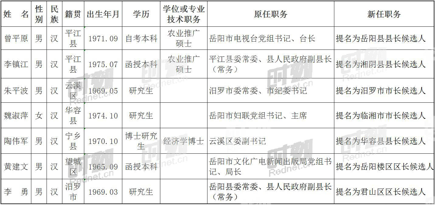 时刻新闻获悉,岳阳8个县市区党政正职调整,包括岳阳县、云溪区、岳阳楼区、君山区、华容县、湘阴县、临湘市、汨罗市。8月13日,8县市区分别召开领导干部大会,宣布省委、岳阳市委决定。时刻新闻一图梳理全部调整。 新闻链接: 田文静任岳阳县委书记 曾平原提名为县长候选人 汪灿任湘阴县委书记 李镇江提名为县长候选人 喻文任汨罗市委书记 朱平波提名为市长候选人 陈阁辉任岳阳楼区委书记 黄建文提名为区长候选人 张中于任岳阳云溪区委书记 谢胜任君山区区委书记 李勇提名为君山区区长候选人 魏淑萍提名为临湘市长候选人 陶伟军提名为华容县长候选人