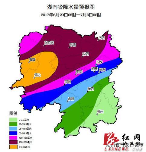 未来一周降雨集中,强降雨带先南后北,27~28日强降雨区位于湘中及偏南地区,29日~7月2日雨带逐渐北抬,湘西、湘北部分地区仍有暴雨、大暴雨,并伴有短时强降水、局地雷雨大风等强对流天气,其中29日~7月1日为最强降雨时段。具体预报如下:27~28日湘中及偏南地区部分大到暴雨,局地大暴雨;29日~7月1日,湘西、湘北部分地区大到暴雨,局地大暴雨;7月2日湘西北部分地区中到大雨,局地暴雨;3日省内降雨减弱,大部分地区以阵性降水为主。6月27日08时~29日08时累计雨量湘中以南40~80毫米,其中湘中偏南部分100~140毫米,局地可达180毫米以上;6月29日08时~7月4日08时累计雨量湘西、湘中以北100~150毫米,其中湘西、湘北部分220~280毫米,局地可达350毫米以上。最大小时雨量90~110毫米。
