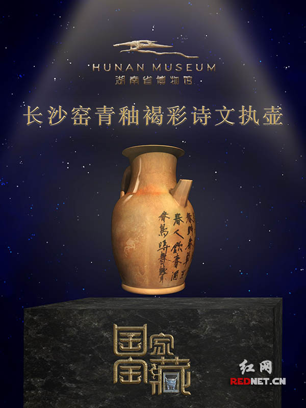 唐代长沙窑青釉褐彩诗文执壶,高19厘米,是用于饮酒的酒壶。因有诗文刻于壶身而得名。