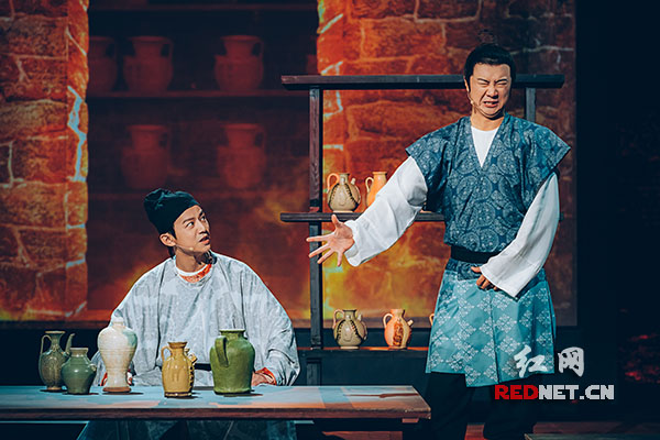 何炅(左)将担任长沙窑青釉褐彩诗文执壶的“国宝守护人”。He Jiong(left) a well-known host performs the poem on Brown colored porcelain ewer.