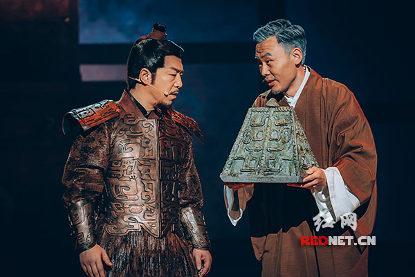 黄渤(左)和王嘉作为“国宝守护人”,将讲述皿方罍的前世命运。Huang Bo (left) a famous actor and Wang Jia(right) a host act as "Guardians of National Treasures,"telling about the fate of theMin Fanglei.