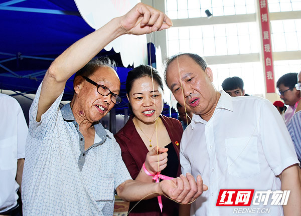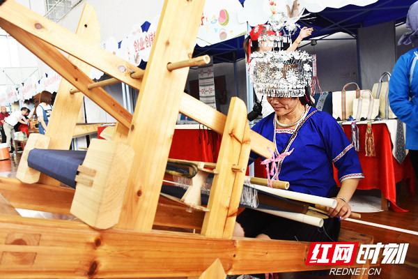 文创展成为现场大亮点。在会同县展台前,神奇的针穿竹丝技艺让怀化市副市长毛健刚(右)倍感兴趣。