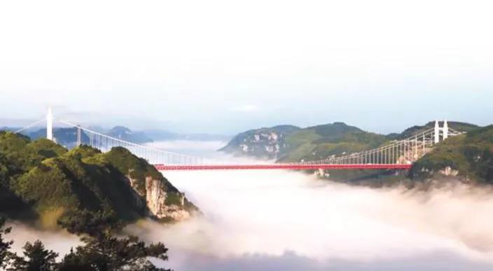 矮寨特大悬索桥(简称矮寨大桥)是由湖南路桥建设集团有限责任公司(简称湖南路桥集团)承建的一座世界级桥梁。大桥建成之初,创造了四个世界第一——世界上跨度最大的峡谷桥梁工程;世界首创“塔-梁分离式悬索桥”新结构;世界首创“轨索滑移法”架设加劲梁新工艺;世界首创碳纤维材料岩锚体系。