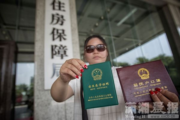 7月14日,长沙市住房保障局门口,黄女士为了证明亲子关系,出示了户口本和孩子的出生证明。图/潇湘晨报记者 张迪