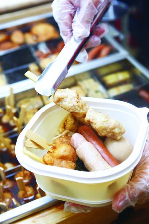 昨天,现代快报记者来到南京新街口地铁站内一家卖关东煮的连锁店铺,各式各样的丸子、豆腐等在格子中翻滚,店员会不时动翻转一下串串。这家店生意还不错。