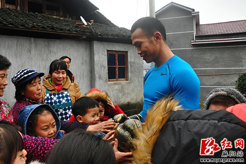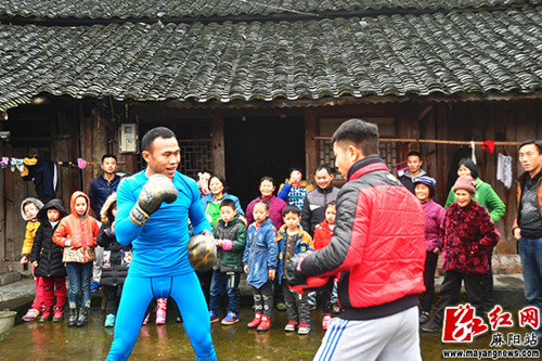 整个合影过程欢快又温馨,孩子们的笑,大家的祝福,还有摄影记者的赞美,这一切都让周志鹏倍感亲切和温暖。面对这么多支持关心他的父老乡亲,周志鹏突然来了兴致,脱去外套,只穿了一件单薄的训练服,当着大伙的面,为大家现场表演了搏击拳术,引得乡亲们连声叫好。