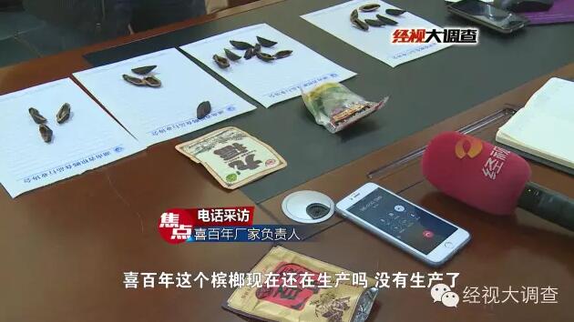 为了慎重起见,记者又通过湖南省槟榔协会的帮助,联系到了厂家,辨认这两种产品是否为他们所生产。通过果肉试味,“林家铺子”厂家表示这些槟榔并不是出自本厂,而“喜百年”厂家负责人表示,自己早已经不再生产“喜百年”产品。
