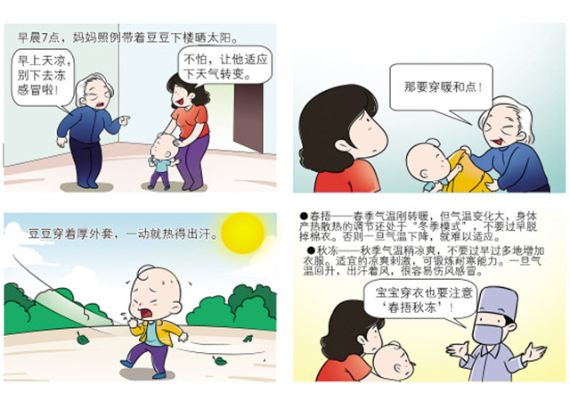 面对时而春风和煦,时而冷风阴雨的天气变化,妈妈应及时为孩子加减衣服。