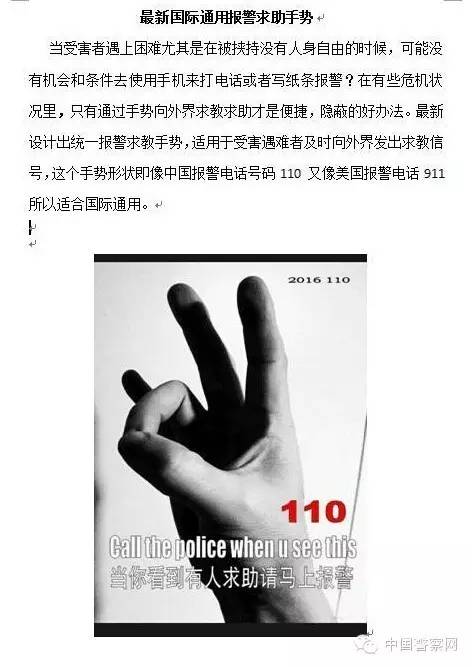 微信朋友圈好多朋友转了这样一条微信:“最新国际通用报警求助手势。当受害者遇到困难尤其是在被劫持没有人身自由的时候,只有通过手势向外界求救求助才是便捷、隐蔽的办法。最新设计出统一报警求救手势,适用受害遇难者及时向外界发出求救信号,这个手势形状既像中国报警电话号码110又像美国报警电话911,所以适合国际通用。”不少网友纷纷表示:这个要转一下,希望多些人知道,少些人受伤害。