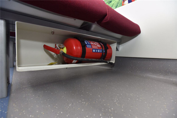 在安全标志的指示下,记者在座位底下发现了灭火器。