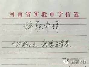 2015年4月14日早晨,一封辞职信引发热评,辞职的理由仅有10个字:“世界那么大,我想去看看”。网友评这是“史上最具情怀的辞职信,没有之一”。经采访得知,作者为2004年7月入职河南省实验中学的一名女心理教师,已经任职11年之久。如此任性的辞职信,领导最后还真批准了。