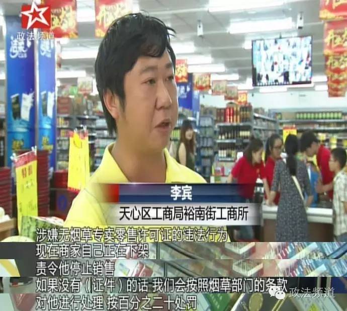 工商执法人员在观看了记者拍摄的视频表示,经查,这家超市并无香烟销售许可证,所有香烟必须马上下架。
