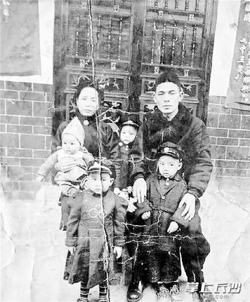 一张由美国人拍摄的家庭合照中,面容清瘦俊朗的何际元穿着军装、皮鞋,和妻子李素梅坐在自家大宅子前,环抱着4个子女。 宁乡县档案馆供图