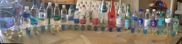 图片上,二十几种市面上常见的品牌瓶装水一字排开,每瓶水前面还摆着一个小杯子,杯子中的水呈现颜色深浅不一的蓝色和黄色。