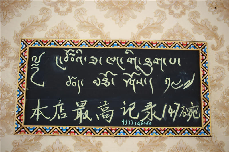 她们唱着跳着为客人服务,热情四溢,店子里的服务员是她的姐妹们。“三碗不过岗”,在这里不吃个八碗十碗绝不放过你。她们这里最高纪录是147碗。卓玛还专门为此制作一块牌子挂在店内,非常醒目,至今无人打破此记录。