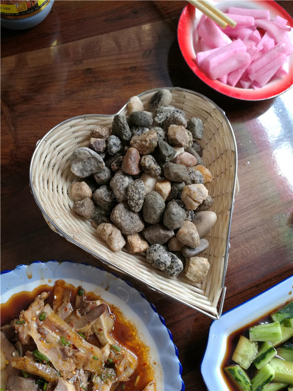 怎么计算多少碗?每吃完一碗面就从桌上拿一块石头计数。想吃多少吃多少。