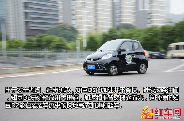 正路行驶中,知豆D2 0-20km/h加速仍不算快,继续深踩油门,知豆D2开始释放出大扭矩,加速感和推背感随之而来,这时候的知豆D2能在茫茫车流中畅快地完成加速和超车。相比大多数燃油汽车,短小精悍的D2在应对复杂的城市路况时显得非常灵动,游刃有余,富有驾驶操控乐趣。