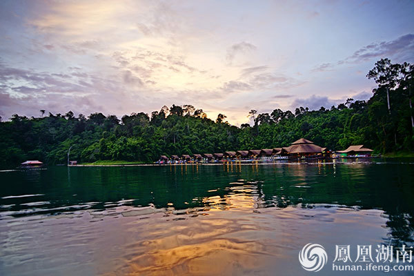 夕阳下的湖上竹筏屋“500Rai”。
