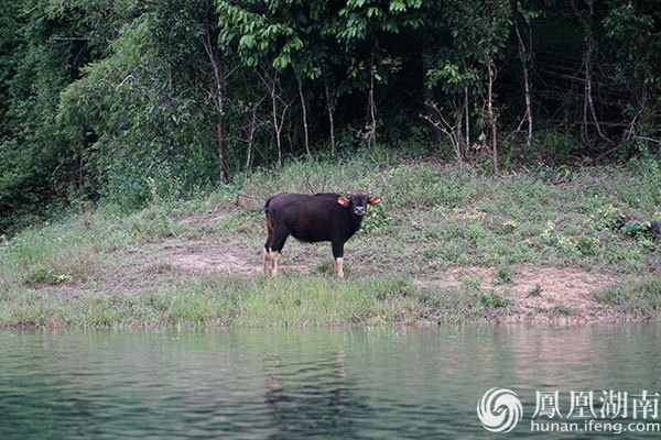 水库里探访野生动物,碰上正在喝水的野牛,警惕性高,稍微有些声响,就钻入山林中。