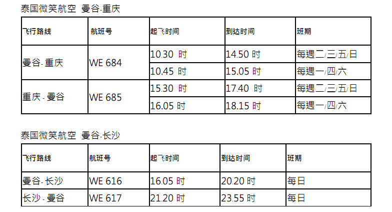前泰国微笑航空提供泰国至中国两个重要城市的航班服务, 包括长沙和重庆。 还有即将投入运营的多条航缐, 而且每个站点均能转飞任意泰国国内航缐。 此外, 为了消除中国乘客对语言沟通上的顾虑, 每个航班上均配有可说流利普通话的乘务人员; 此外还有美味的泰式食物和免费20公斤行李托运服务。