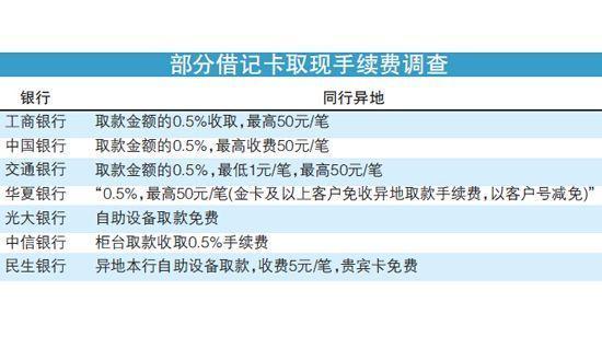 北京商报记者调查发现,目前多数银行执行本行取现免费、跨行取现单笔2元的标准,对异地、跨境取现则在2-12元左右不等,贵宾卡可享受每月几笔免费取现的优惠。