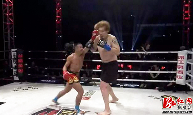 红网麻阳站讯 11月6日晚,解放军拳王周志鹏“以小搏大”和韩国巨兽崔洪万在怀化展开对决,周志鹏两记重拳击中对手下巴,险些将巨兽击倒!最终周志鹏毫无争议的点数击败崔洪万。