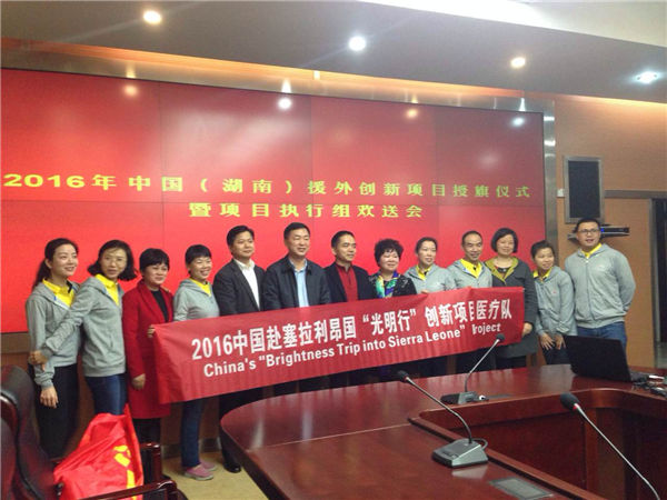 11月18日,2016年中国(湖南)援外创新项目授旗仪式暨项目执行组欢送会在湖南省卫生计生委举行。“我们有6个卫生援外创新项目启动,今天我们欢送首个创新项目援塞拉利昂光明行医疗组出发。我希望大家一定在保障自身安全的前提下,积极实施援外创新项目,以高超精湛的技术医治好患者,以优良周到的服务态度传播中华文化,严格按照相关方案,保质保量的完成任务,不断积累经验,为下面创新项目做好表率作用。”欢送会上,湖南省卫生计生委副主任张义昌说。