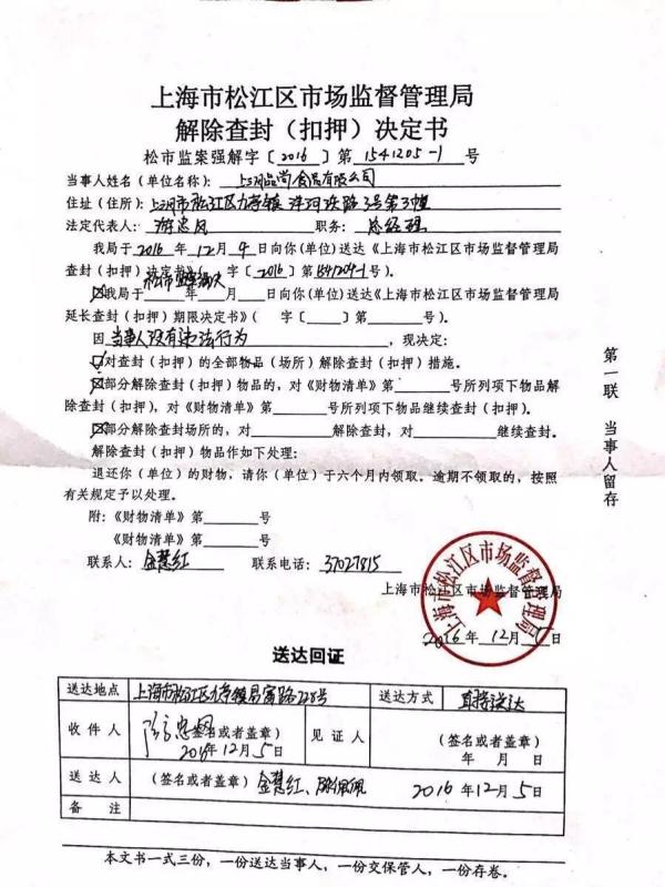 送达上海品尚食品有限公司的《上海市松江区市场监督管理局解除查封(扣押)决定书》。