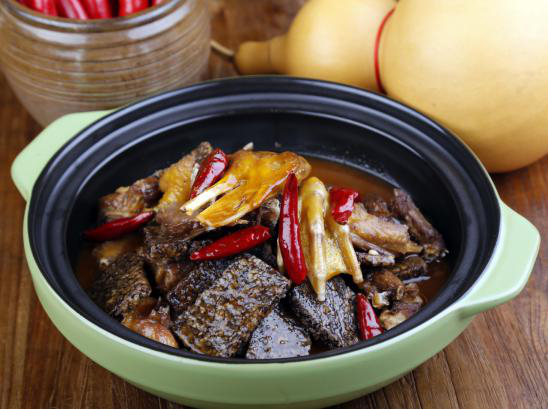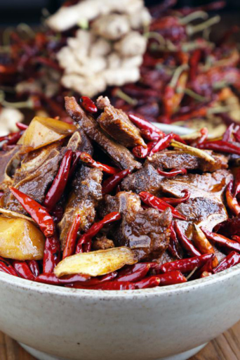 在古代的新年祭祀中,有杀三牲祭天的传统,牛头通常用来祭天,而牛龙骨则会献给土司作为过年的大菜,寓意土家人的主心骨!这个习俗流传到现在,重要节日土家族人围坐一起,都会享用这道大菜,而且第一块龙骨都会敬给席上最尊敬的人。八种辣椒红火富裕、大片老姜温暖幸福、霸气牛龙骨身体康健、入味凤爪抓财进宝。