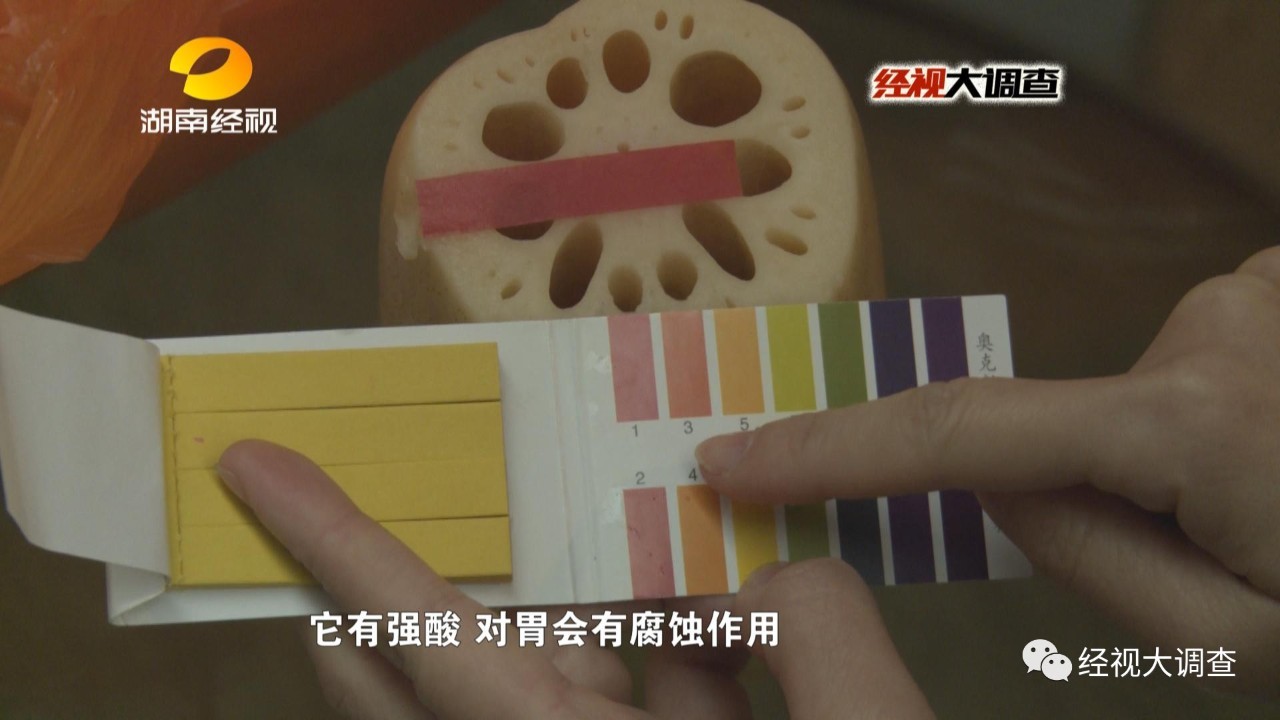 而记者在购买的三份经过了漂白的莲藕,则是异常干净。同时,经过柠檬酸漂白过的莲藕,散发出一股酸味。记者使用PH试纸分别对三份漂白过的藕和一份未经漂白的藕进行了测试。