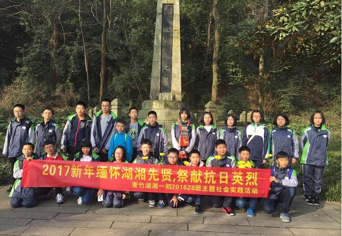 2017年1月22日,正是中国的农历腊月二十五,离春节只有几天了。这一天,在岳麓山上的黄兴、蔡锷、陈天华、禹之谟等湖湘先贤墓碑前,在奋勇抗日的七十三军阵亡将士墓碑前,在新民路口的新民学会旧址(暨蔡和森故居)里,出现了一群稚气未脱却又正走向成熟的初中生。他们是来自长沙市青竹湖湘一外国语学校初一28班的近30名同学。这次主题为“2017新年缅怀湖湘先贤,祭献抗日英烈”的集体行动,是该班同学亲手组织策划的一次富有意义的寒假社会实践活动。