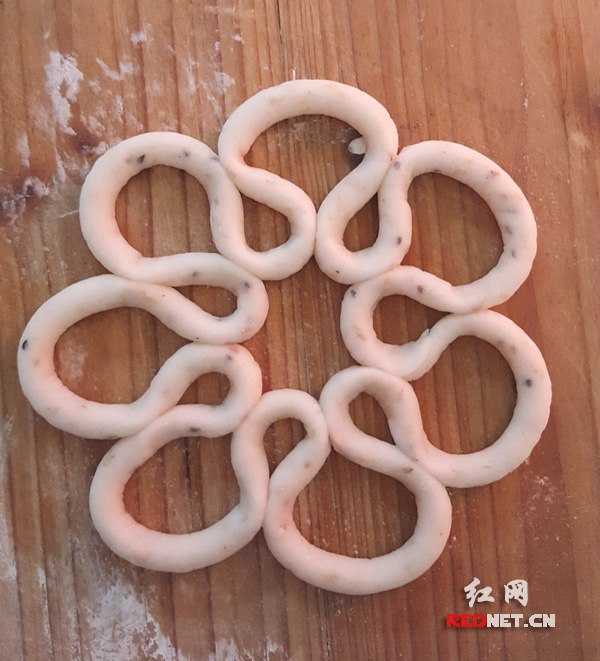 接下来将揉好的糕团揪成一个个小剂子,再搓成细细长长的小圆条,然后在弯弯绕绕中,做成首尾相连的七环图案