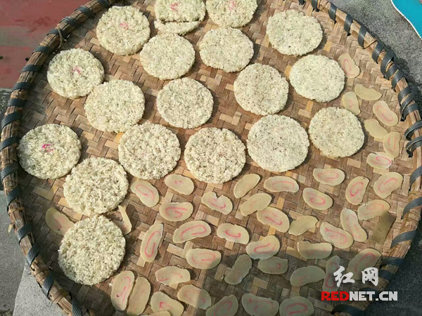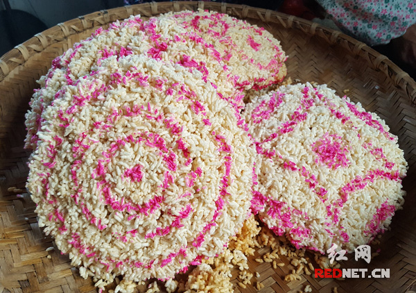 曹老师说,选取上好的糯米,淘洗,滤干,用饭甑上大锅蒸熟后,盛进竹制的圆圆团馓框里,做成一个个圆圆的糯米饼,放在簸箕里,或棉布上,然后摊在阳光充足的地方晾晒,晒上几天,再用红色染料,点上几个梅花印,画上红红的囍字,等水份完全晒干就可以准备油炸了。