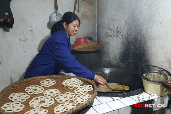 准备年糕期间,一家人,甚至一个家族的妇女围坐在一起,边做边聊,小孩也来凑个热闹,曹老师的外甥女在资兴市区当老师,走出库区的她告诉记者:“虽然做的样式不咋地,但也有成就感。”不一会,做好的“告仔”堆叠在簸箕里成了一座小山,接下来就是最后一道工序,油炸了。
