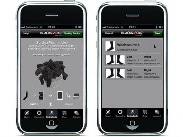 来自瑞士的袜子生产商Blacksocks,早在2012年的时候用互联网+的思维,解决了这个难题——智能袜子,每只袜子都和你的iPhone手机绑定了,通过手机来查找哪两只袜子是在一起的。道理很简单,像公交卡那样,每只袜子上面都有一个射频芯片,同时手机通过一个专用的应用,可以识别芯片上的信息。通过这样的设置,在一开始两只袜子就绑定在了一起,妈妈在也不用担心我找不到袜子了!